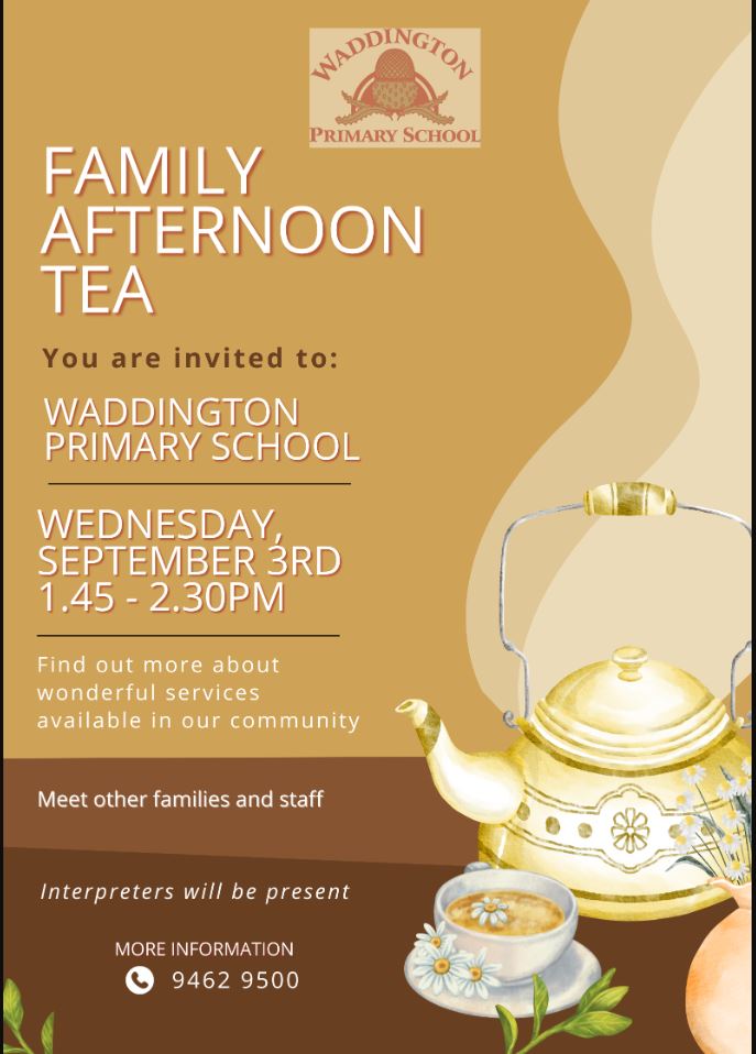 Please see the invitation below for families to attend our Family Afternoon Tea. We will have representatives from Communicare, Ngala and the Smith Family. We look forward to seeing you there!