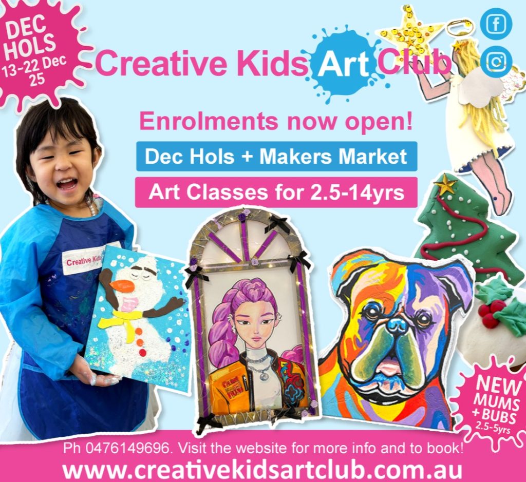 Please see below information about some art school holiday programs for your child. Visit their website for further information and to make a booking. https://www.creativekidsartclub.com.au/school-holidays/