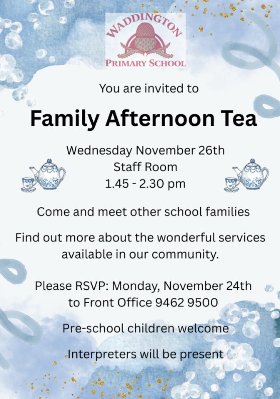 Please see below an invitation for our Family Afternoon Tea next week on Wednesday 26 November. Please RSVP by Monday 24 November if you would like to attend.